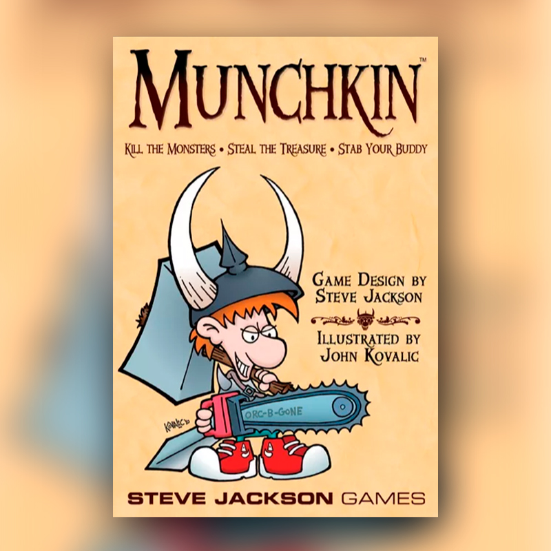 Este juego completo captura la esencia de la «Experiencia Dungeon»… sin todas esas idioteces del rol. Todo lo que tienes que hacer es matar monstruos y coger objetos mágicos. ¡Y qué objetos mágicos! Ponte el Yelmo Cornudo y las Botas de Invocación de Hemorroides. Blande el Báculo de Napalm…, o quizás la Motosierra de Mutilación Sangrienta. Empieza masacrando a la Planta en un Tiesto y a la Babosa Babeante, y encuentra la manera de llegar al Dragón de Plutonio… Munchkin es rápido de jugar y ridículo, y puede llevar a cualquier grupo de jugadores de rol a la risa histérica. Y mientras se ríen, puedes robarles lo que lleven. Munchkin es un juego para 3-6 jugadores (pueden jugar 2, pero es más divertido con más gente). La duración de una partida es de una hora, más o menos. Diseñado por Steve Jackson. Ilustrado por John Kovalic.