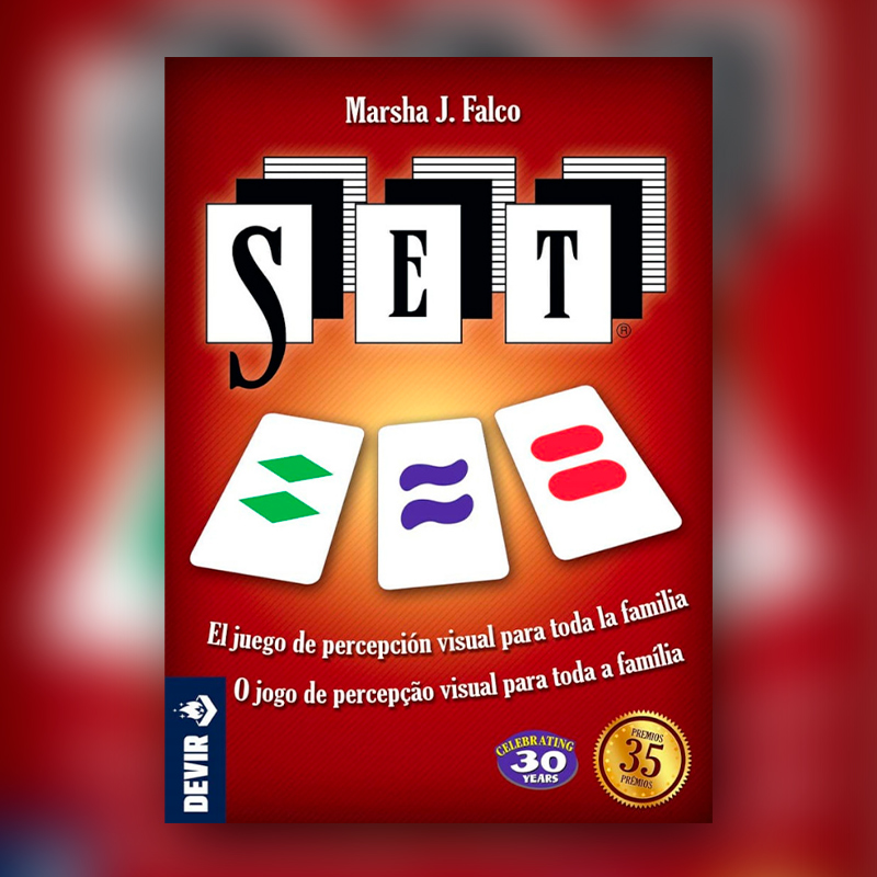 Un reto fascinante para cualquier grupo de juego. Para obtener un SET un jugador debe encontrar 3 cartas en las que cada una de las 4 características sea igual o diferente en todas ellas. Las características son: símbolo (óvalos, ondas o rombos), color (rojo, verde o lila), número de símbolos (uno, dos o tres) y fondo (sólido, rallado o sin fondo). La edad no es una ventaja en este juego y SET es un muy divertido para toda la familia ya que no requiere ningún conocimiento previo.